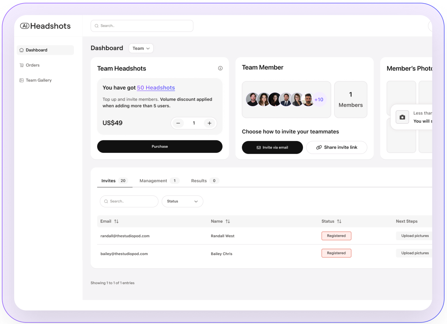 Invite your team in seconds with a unique link for each member, no scheduling is needed. They can easily upload or snap their photos, or you can upload them on their behalf.